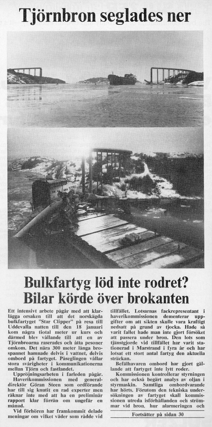 1980 körde ett bulkfartyg in i en av Tjörnbrons bropelare och fick bron att rasa. Ur Sjöfartstidningens arkiv.