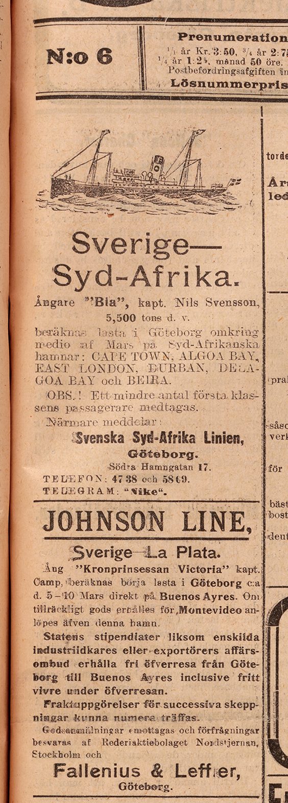Några månader innan det första numret av tidningen nådde läsarna hade ångaren Kratos återvänt till Sverige efter sin första resa till Sydafrika, och därmed var den svenska transoceana linjesjöfarten född. Samma år fick Sverige sin första förbindelse med Sydamerika när Johnsonlinjen öppnade trafik på Rio de la Plata.