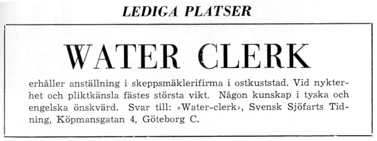 Annons om ledig plats från 1956. Ur Sjöfartstidningens arkiv.