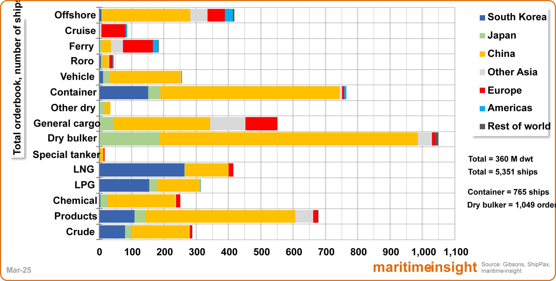 Enligt våra uppgifter så ligger det idag drygt 5.300 fartyg i beställning vid världens varv och 3.300 av dem ska byggas i Kina. Uttryckt i gross ton så uppgår orderboken till 291 miljoner. Kinas andel är 64 procent vilket motsvarar 185 miljoner gt.