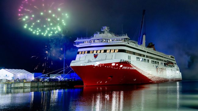 Den nybyggda färjan Spirit of Tasmania V lämnade varvet i Rauma under torsdagen med destination Leith i Skottland.