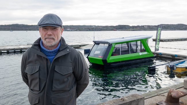 Det är näst intill tomt vid flytbryggorna hos Marstrands Segelsällskap, med undantag för ett tämligen udda flytetyg – Celia One. Den futuristiskt utformade gröna elbåten med sina stora panoramafönster är en annan syn än den typ av båtar som brukar ligga i hamnen. Vid ett bord ombord sitter en av bolagets grundare Tobias Husberg och arbetar.