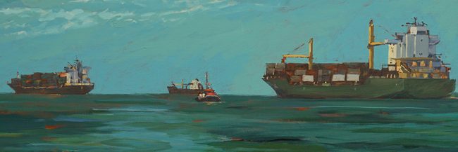 Konstutställning på ”Slottet” Partille Herrgård med Sten-Yngve Johansson, som målar containerfartyg på öppet hav, och med Lars Härngrens båtmodeller/allmogebåtar i trä.