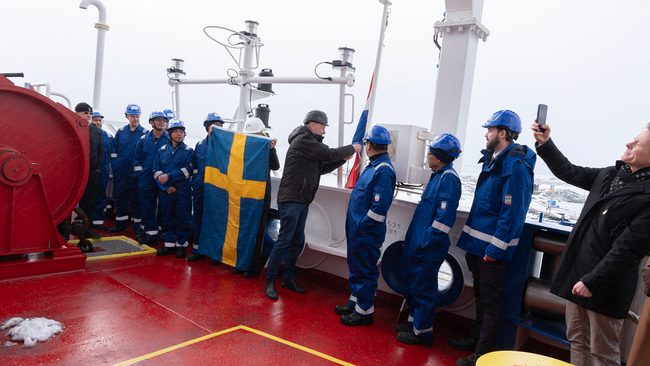 Solen bryter fram i samma ögonblick som den svenska flaggan hissas. Ove Johnsson, vd för Veritas Tankers, står med den nyss nedtagna holländska i famnen medan dottern Signe Johnsson hissar den nya. Strax intill står Astellas befälhavare Roger Niklasson och hans besättning.