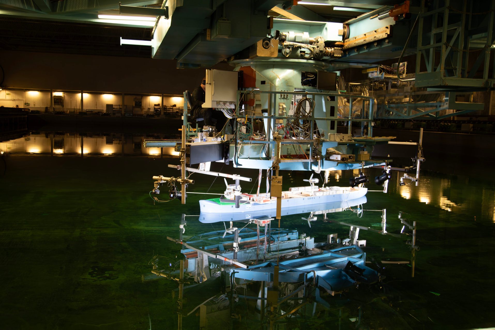 Modellfartyget i bassängen har inga vingsegel. Det beror på att man inte kan skala upp tester i vind och vatten samtidigt; man måste välja. För att simulera kraften från seglen har modellen istället fläktar på däck som, när fartyget ändrar kurs, byter varvtal enligt noggranna beräkningar.